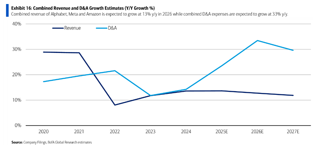 如果说摩根士丹利揭示了投入规模的“冰山之下”,那么美银则点明了这些投入未来将如何转化为实实在在的成本压力。其核心观点是,华尔街对未来折旧费用的增长速度“反应迟钝”。
