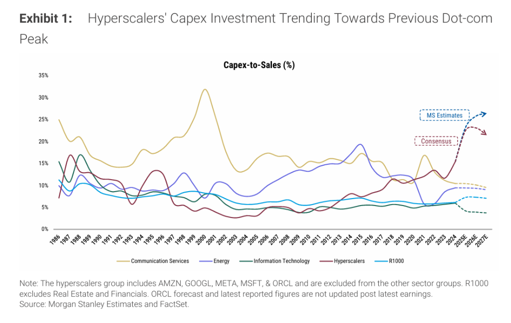 摩根士丹利的报告将当前的AI投资潮与历史上的两次资本狂热进行了对比:一次是互联网泡沫时期的电信业光纤建设,另一次是页岩油革命中的能源业钻探。报告指出,当前的资本强度正在逼近前者的峰值。而与以往不同的是,科技巨头正通过日益复杂的财务手段来加速扩张,使得传统的资本支出(Capex)数据无法完全捕捉其投资的全貌。