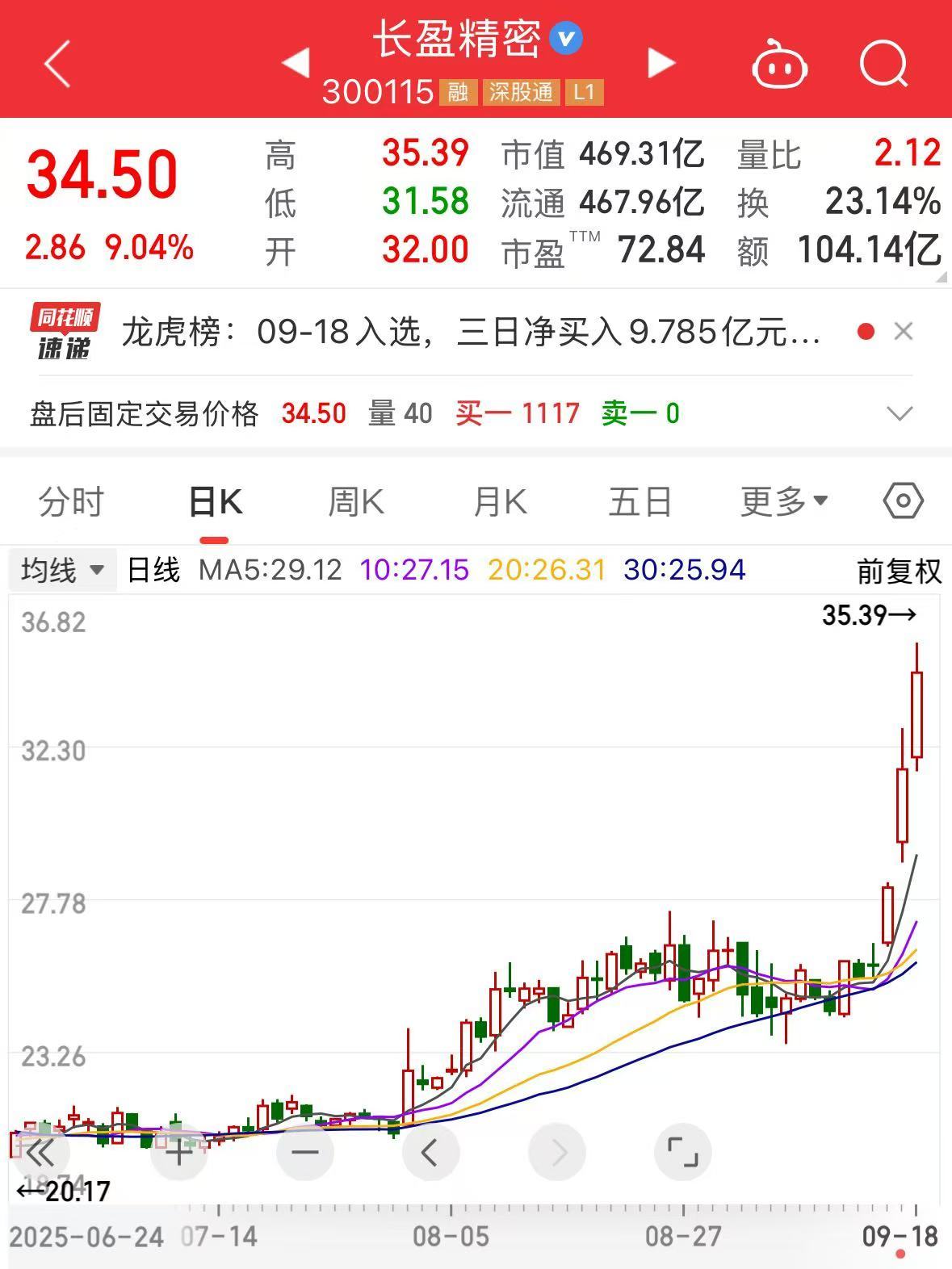 盘面上,今日截至收盘,长盈精密涨幅超9%,此前两日分别上涨8.94%、12.44%。