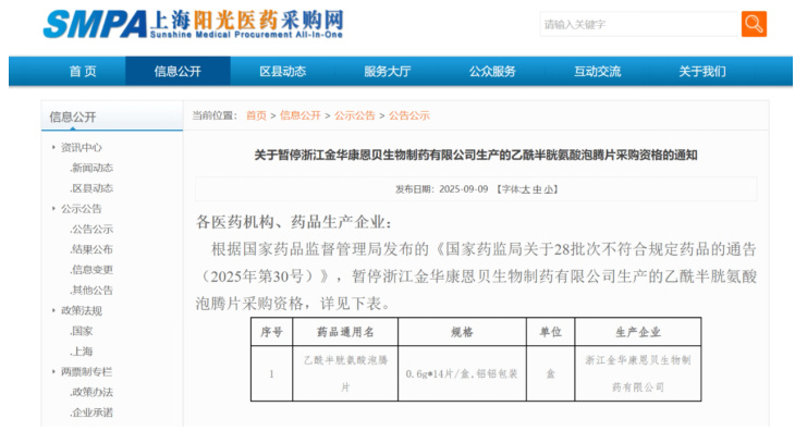 上海阳光医药采购网近日发布公告显示,据国家药监局《关于28批次不符合规定药品的通告(2025年第30号)》,浙江制药股份有限公司(下称“康恩贝”)子公司浙江金华康恩贝生物制药有限公司生产的乙酰半胱氨酸泡腾片,因“性状不符合规定”被暂停采购资格。