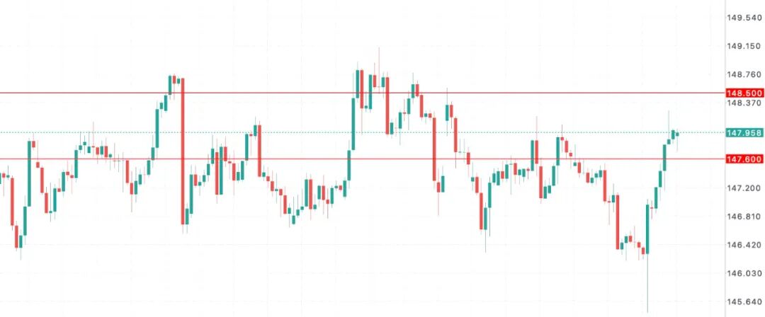 周四交易时段,受美元反弹带动下,美元兑日元走高。日内更低触及146.76水平,更高测试148.26水平。