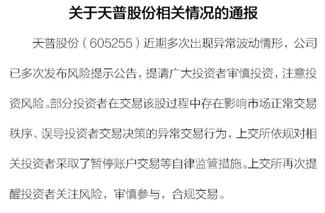 9月18日晚间,上交所发布情况通报称,(605255)近期多次出现异常波动情形,公司已多次发布风险提示公告,提请广大投资者审慎投资,注意投资风险。部分投资者在交易该股过程中存在影响市场正常交易秩序、误导投资者交易决策的异常交易行为,上交所依规对相关投资者采取了暂停账户交易等自律监管措施。上交所再次提醒投资者关注风险,审慎参与,合规交易。