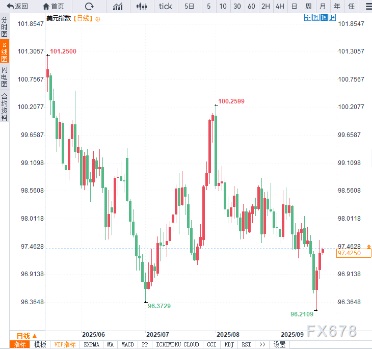 (美元指数日线图,来源:易汇通)北京时间10:17,美元指数现报97.45。