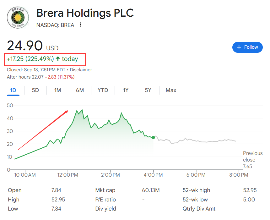 见闻文章写道,知名投资者木头姐联手阿联酋,向纳斯达克上市的Brera控股注资3亿美元,该公司将转型为专门囤积Solana代币的财库公司并更名为Solmate。消息公布后,这家公司股价一度暴涨592%,收盘涨幅仍达225%。