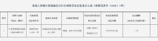 9月19日金融一线消息,中国人民银行滨海新区分行行政处罚决定信息公示表显示,天津滨海德商村镇银行因未按规定收兑停止流通的人民币,被中国人民银行滨海新区分行警告,并处3000元罚款。