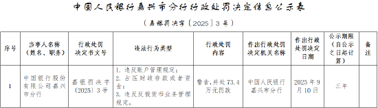 9月19日金融一线消息,中国人民银行嘉兴市分行行政处罚决定信息公示表显示,股份有限公司嘉兴市分行因违反账户管理规定;占压财政存款或者资金;违反反假货币业务管理规定,被中国人民银行嘉兴市分行警告,并处73.4万元罚款。