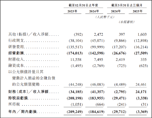 由于目前尚无商业化产品,应世生物于既往报告期内均无营收,2023年、2024年和2025年之一季度,公司经营亏损分别为1.74亿元、1.43亿元和2750万元;期内亏损分别约为2.09亿元、1.85亿元和336.9万元。截至2025年一季度,公司累计亏损已达7.65亿元。