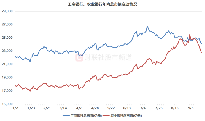 注1:工商银行、农业银行年内总市值变动情况(截至9月19日收盘)