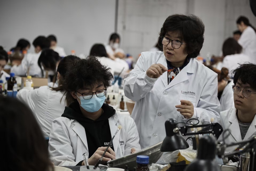朱主任陪笔者在楼内参观。在服装与服饰设计工作室,带教老师介绍了几件由学生设计的毕业作品;在T3007人工智能应用工作室,七八名学生正专注地敲击键盘;在珠宝工坊,几名学生正全神贯注地听老师讲解;走进非遗项目工坊,同学正苦练指尖上的绝技。笔者还观摩了古陶瓷修复工作室和古书画修复工作室,尤感兴趣的是,这里还设有文物修复理化材料实验室。原来,待修文物进校后须进此室“体检”,先用现代科技手段检测分析材质,而后才能对症用材修复。