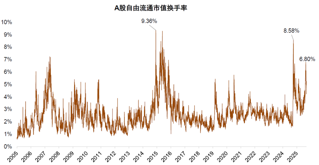 近期A股仍在短线调整期,不改中期趋势。今年7-8月A股出现较快上涨,成交也一度放大,日换手率一度维持6%以上,两融余额创历史新高。历史经验显示,A股每次换手率升至 5%以上,指数后期往往易出现一定幅度的短期调整,近几年典型时段如 2019 年 4 月、2020 年 7 月以及2024 年 10 月,上述三个阶段指数在后续均出现 1-3 个月左右的调整期。A股8月底至今虽数次接近或略突破前期高点,但总体来看仍处于震荡调整阶段。因成交较快上涨带来的调整一般不改变中期趋势,我们认为去年924以来的上涨行情或仍延续。