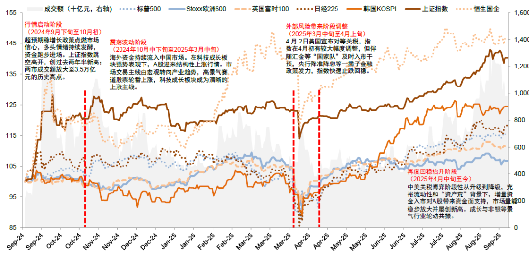 1) 上涨行情概况:三次上涨行情均表现出持续时间较长(2-3年左右)、整体涨幅明显、增量资金入市带来成交显著放大的特征。行情在启动起始期均为历史“大底”(2005年6月、2013年6月、2019年1月),投资者对后市预期极度悲观时期;从历史低点到指数层面的震荡上行,形成一定赚钱效应后,市场波动率逐渐加大,在上涨过程中也有数次震荡回调,伴随情绪反复、投资者行为分化等特征。相较之下,2024年9月A股从“大底”回升,期间也经历数次波折调整(如2024年10月、2025年4月等),投资者入市显现结构分化。