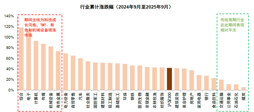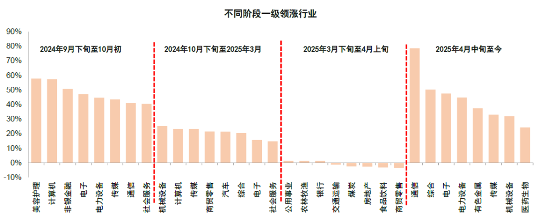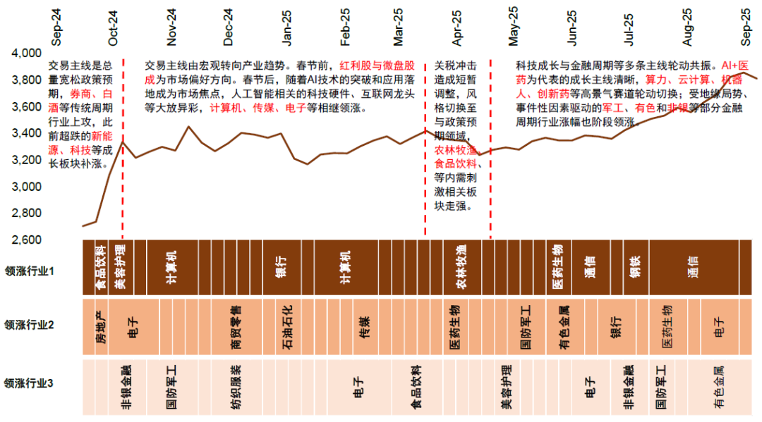 回顾过去几轮主线行情:1)2005-2007年板块轮动较为明显,整体来看大小盘均有表现,周期和金融板块保持高关注度,在该轮行情中涨幅最为突出。2)2013至2015年市场上行阶段,偏科技成长风格的TMT板块如传媒、计算机、通信和电子等表现突出,尤其在2013年和2015年上半年这两个阶段;2014年下半年尤其第四季度金融地产也有阶段性表现。3)2019至2021年,2019年初至4月市场普涨;2019年下半年转为消费、科技和制造等成长龙头轮番驱动上涨的结构性行情。4)2024年9月至今本轮行情驱动由宏观政策转向产业趋势,AI产业链、创新药、高端制造、新能源等成长风格是本轮上涨的结构主线,期间有色、券商等行业在业绩支持下也有相对表现。