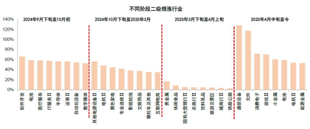 2) 驱动因素:宏观经济或流动性改善、结合关键产业景气趋势上行。2007年的A股上涨处于我国加速工业化之中、投资与出口拉动经济高速增长,并与全球景气周期共振,商品走强是主线之一,这也是股市上涨重要主线。2015年的股市处于我国经济转型与产能调整期,也处于改革憧憬及货币宽松周期,流动性环境显著变化对指数贡献较大。2021年应对外部不确定性,科技制造的逐步国产化以及绿色发展背景下全球新能源汽车渗透率提升,新能源、半导体等成长风格结合消费改善预期,相关领域轮番带动指数上行。2024年本轮上涨到目前为止处于国际货币体系变局与我国创新叙事深化的阶段,成长风格为行情主线。结合2025年中报,本轮领涨行业较多处于景气阶段,具备基本面支撑。