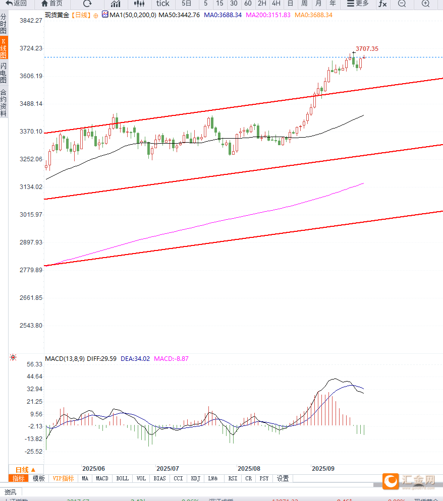 均线系统维持多头排列,MACD仍处于正动能区间,但动能柱有所收窄,显示上行趋势放缓。若价格跌破3650美元,则可能回调至3600美元整数位寻求新的支撑。