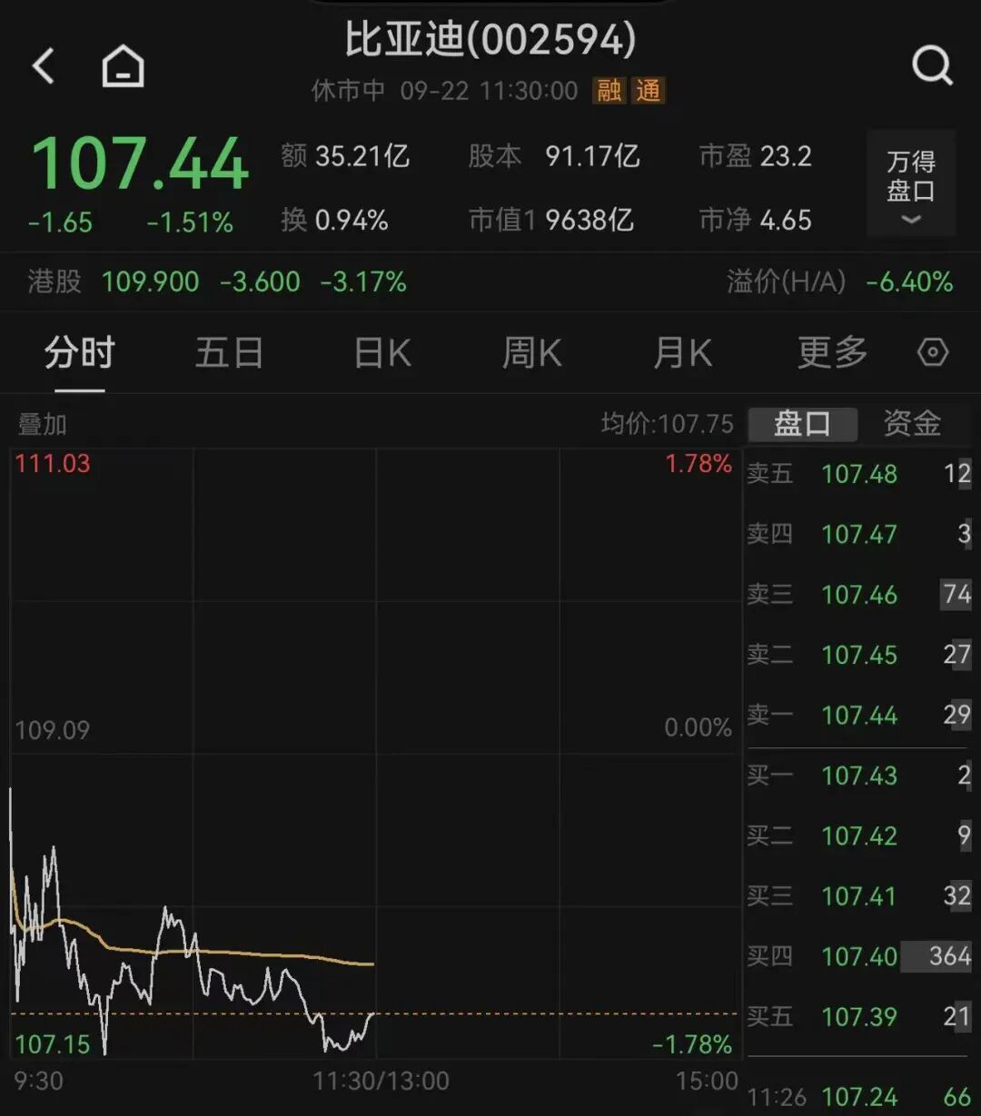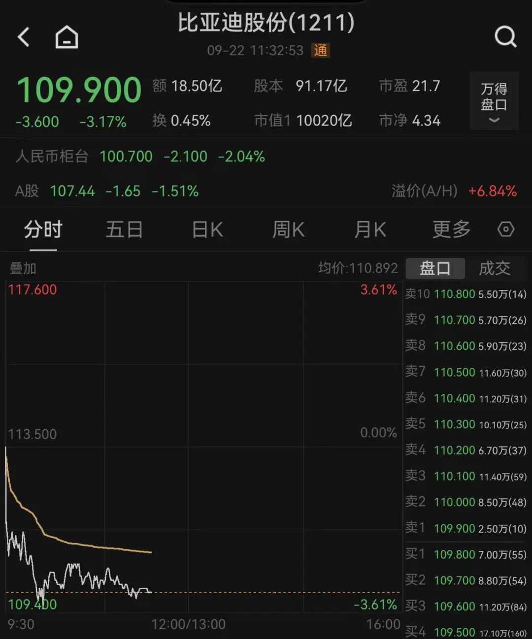 二级市场上,截至午间收盘,比亚迪A股跌1.51%,报107.44元,最新市值为9638亿元。截至发稿,比亚迪港股跌3.17%,报109.9港元,最新市值为10020亿港元。