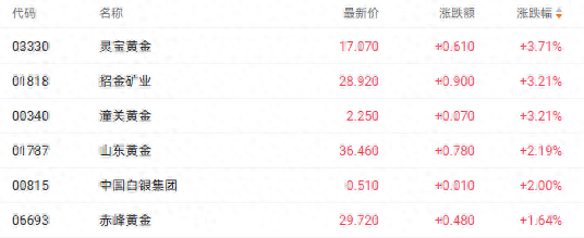 财联社9月22日讯(编辑 胡家荣)受益于国际持续走强叠加美联储降息预期,港股黄金股多数上涨。截至发稿,灵宝黄金(03330.HK)、招金矿业(03330.HK)、潼关黄金(00340.HK)、山东黄金(01787.HK)分别上涨3.71%、3.21%、3.21%、2.19%。