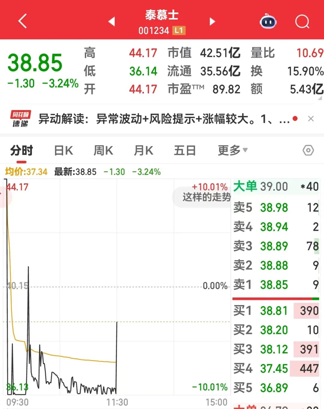此前已实现5连板的(001234)今日早盘“炸板”后直线跳水跌停,盘中上演“天地板”。截至早盘收盘,该股跌3.24%,成交总额5.43亿元,换手率15.9%。