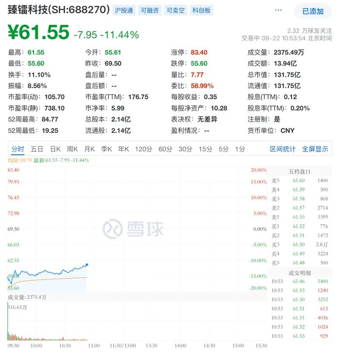 根据交易数据,22日臻镭科技在 *** 竞价阶段即大幅低开,开盘后继续下探。尽管盘中有所回升,但截至上午10:50,股价报61.21元,市场情绪依然谨慎。