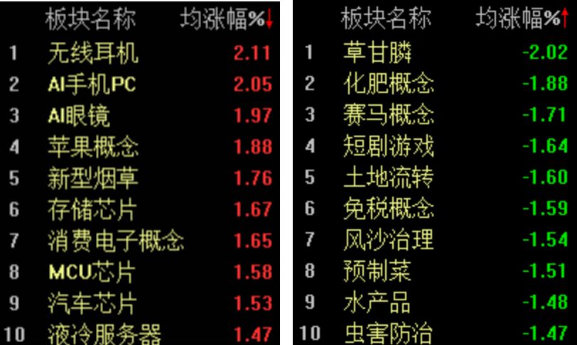 板块方面,摩尔线程IPO本周上会,概念股受提振大涨,、、、涨停。消费电子产业链在iPhone 17销量超预期带动下全线走强,秒板逼近历史高点,涨超14%,、、涨停。