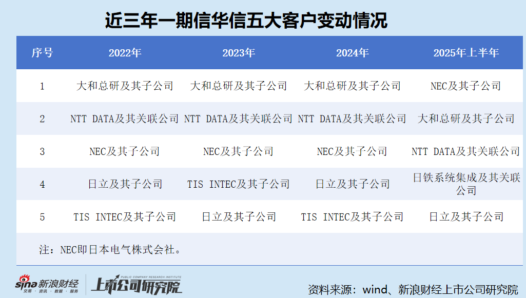 报告期内,NEC方案创新株式会社、株式会社日立解决方案、株式会社NTT DATA、日本电气株式会社、新日铁住金系统集成株式会社均为华信股份及信华信的五大客户,其中NEC方案创新株式会社为日本电气株式会社的全资子公司。