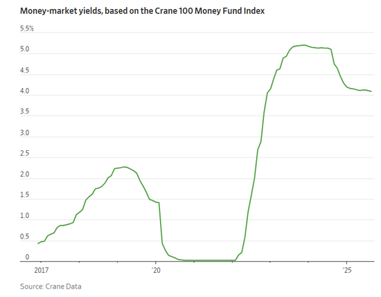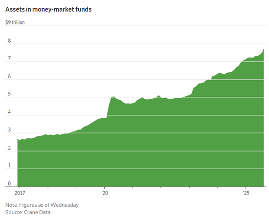 最新一轮涌入货币基金的浪潮始于2022年——当时美联储启动加息周期。这类主要投资短期 *** 债券的基金,收益率随之上行,为投资者带来了多年未有的高现金回报。此后,即便股市一路飙升至历史高点,许多人仍将投资组合中更大比例的资金配置在这类“类现金”资产上。