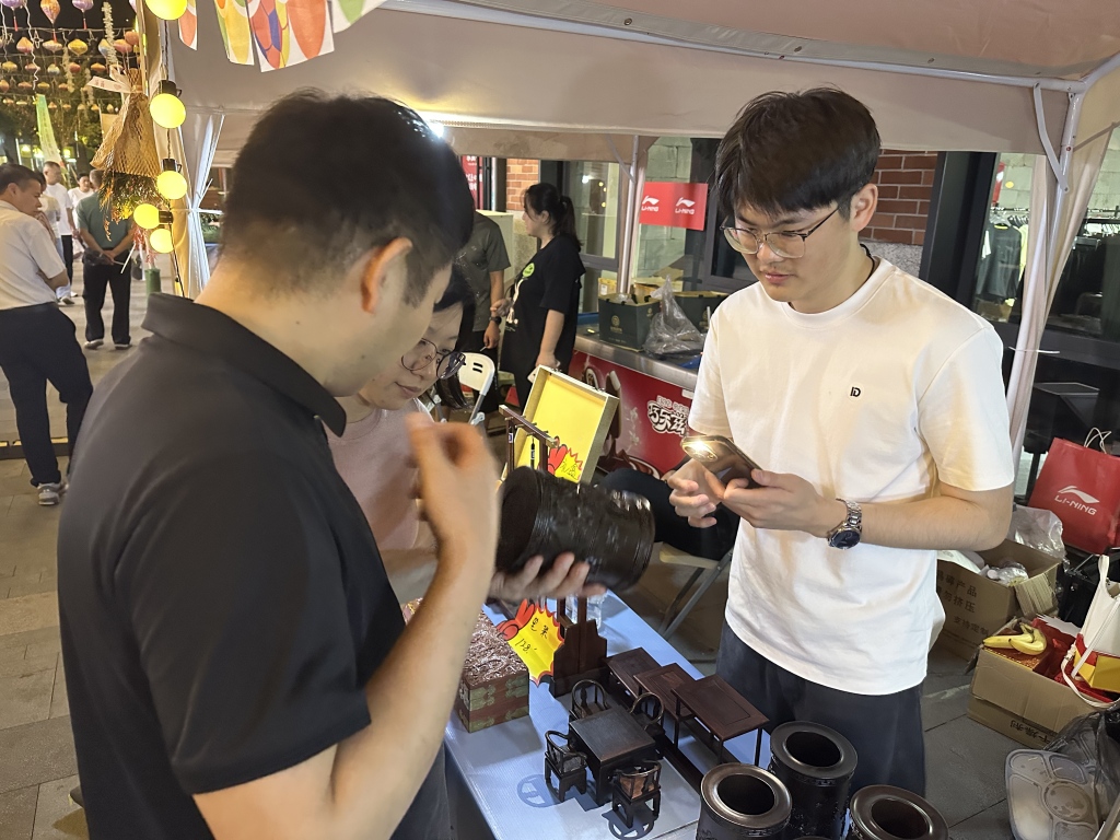 澎湃新闻记者在现场观察到,部分来自南通的产品颇受欢迎,海门区紫轩阁红木工艺品厂展台前,很多上海市民询问和购买热情很高,“这两天,笔筒当场线下成交30多单,各种品类的镇纸也非常受群众欢迎,两天就基本销售一空。”现场工作人员告诉澎湃新闻记者,虽然展台上摆放的笔筒和镇纸都属于价廉物美的产品,但厂里还有类似于优质红木家具等价格更高一些的大件,“通过本次活动,还吸引几十位有红木定制消费意向的顾客,添加微信、 *** 等,沟通后续合作。”