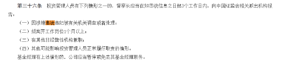 根据 *** 《基金管理公司投资管理人员管理指导意见》,投资管理人员因涉嫌违法违纪被有关机关调查或者处理,督察长应当在知悉该信息之日起3个工作日内,向中国 *** 相关派出机构报告。