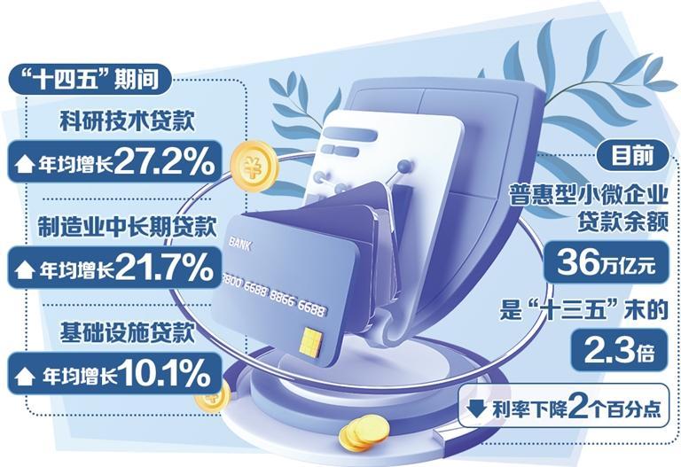 银行业融资主渠道作用有效发挥。金融监管总局局长李云泽表示,5年来,银行业保险业为实体经济提供新增资金170万亿元。科研技术贷款、制造业中长期贷款、基础设施贷款年均增长27.2%、21.7%、10.1%。目前普惠型小微企业贷款余额36万亿元,是“十三五”末的2.3倍,利率下降2个百分点。