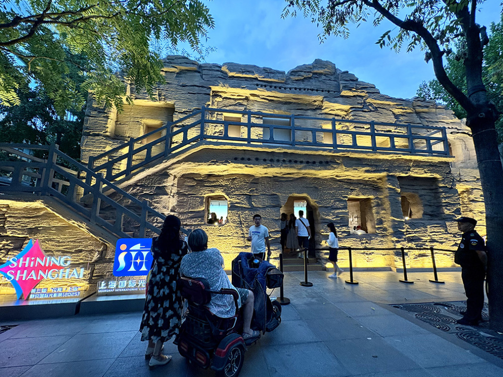 转到静安公园门口,一座“敦煌莫高窟”建筑惹人注目,这是静安光影展项目“洞见220”快闪体验空间,内部有莫高窟第220窟等比例模型以及各种敦煌文创。“丝路光影”投影秀、“乐舞妙音”艺术表演将于国庆期间在此上演,以墙面为画布,展现敦煌艺术。