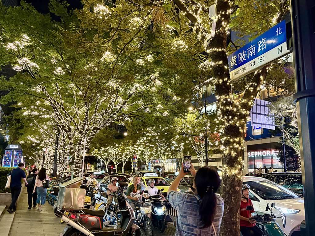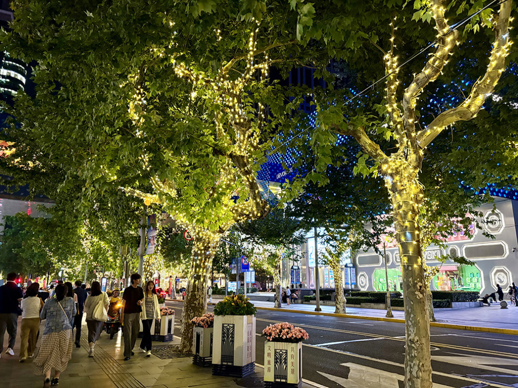 光影的作用,从长期来看或许更为显著。淮海中路的行道树自今年4月16日起开始亮灯,周边支马路也陆续点亮,与此同时,位于淮海中路核心地段的香港广场夜间客流悄然增长。