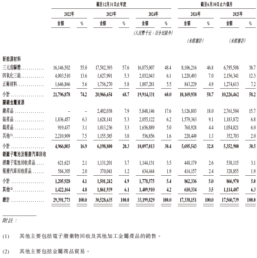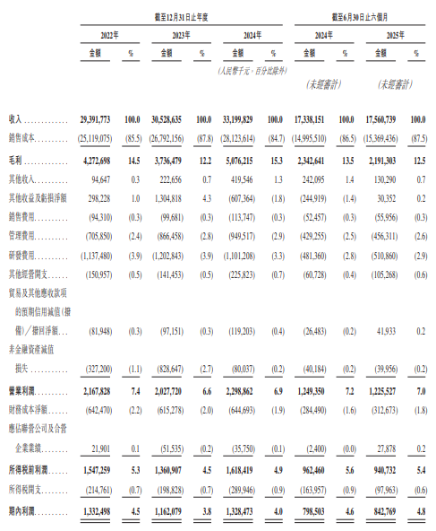 招股书显示,在过去的2022年、2023年、2024年和2025年前六个月,格林美的营业收入分别为人民币293.92亿、305.29亿、331.998亿和175.61亿元,相应的净利润分别为人民币13.32亿、11.62亿、13.28亿和8.43亿元。
