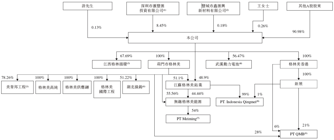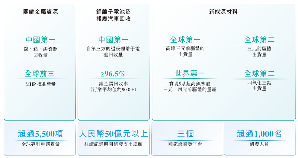 根据弗若斯特沙利文报告:在关键金属资源行业,格林美在镍、钴、钨资源回收方面于中国排名之一,按2024年MHP权益产量计,格林美位列全球前三;