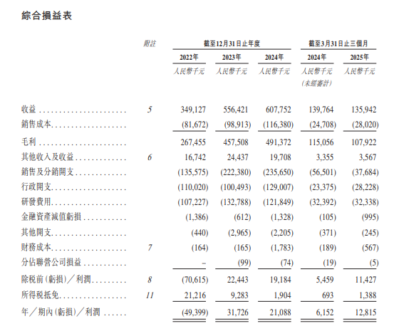 招股书显示,在过去的2022年、2023年、2024年和2025年前三个月,长风药业的营业收入分别为人民币3.49亿、5.56亿、6.08亿和1.36亿元,相应的净利润分别为人民币-4,939.9万、3,172.6万、2,108.8万和1,281.5万元。
