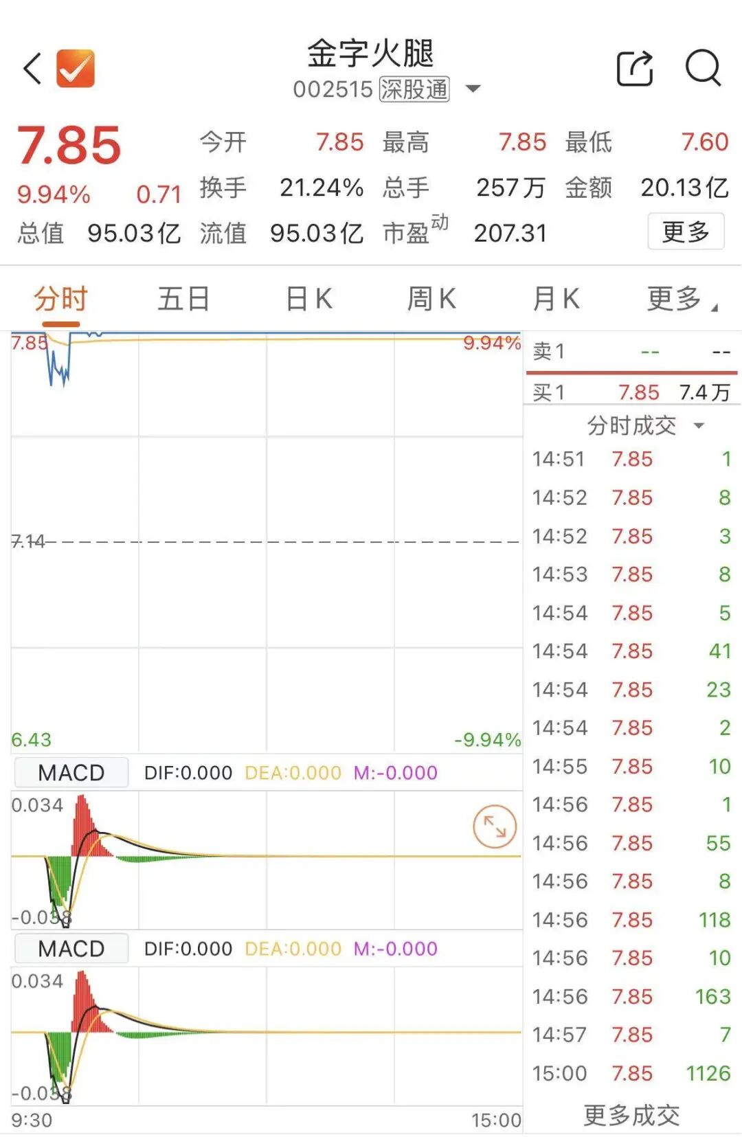 9月23日,金字火腿开盘后涨停,短暂打开涨停板后又封上涨停。截至收盘,报7.85元/股。