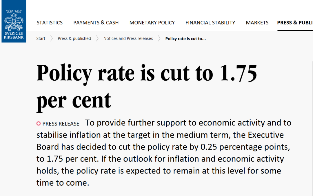 【导读】瑞典央行降息25个基点至1.75%,降息幅度超市场预期