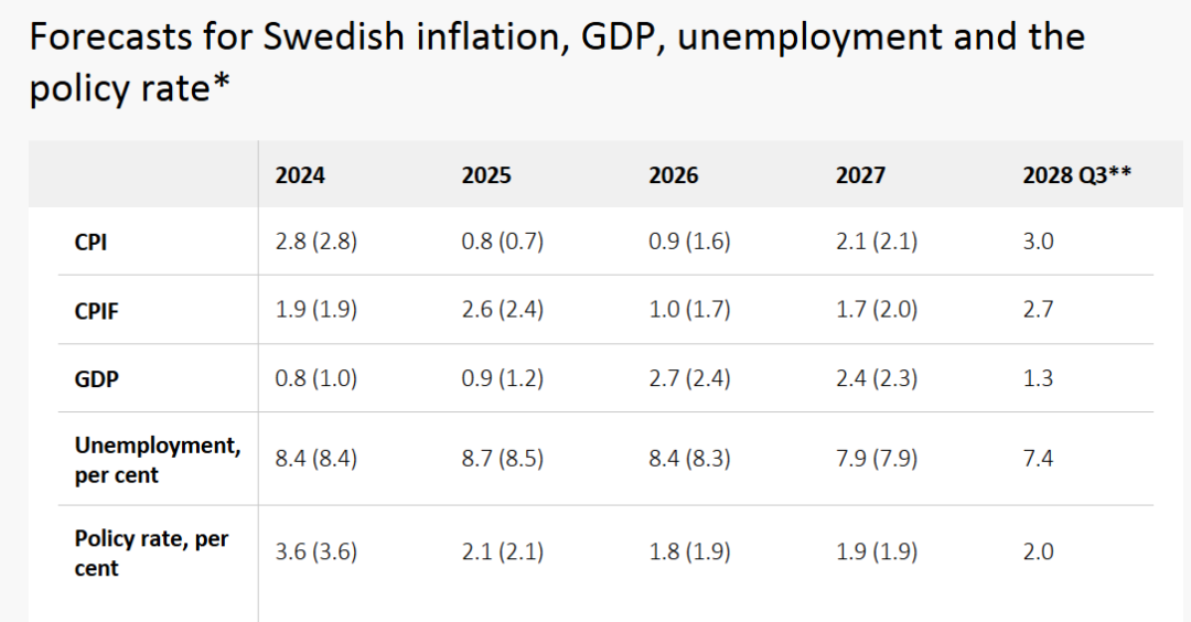 瑞典央行给出最新的宏观经济数据预测:预计2025年CPIF通胀为2.6%,预计2026年CPIF通胀为1.0%;预计2025年GDP增速为0.9%,预计2026年GDP增速为2.7%。