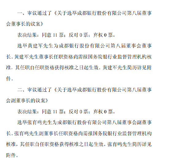 9月23日金融一线消息,日前发布公告称,公司第八届董事会第十九次(临时)会议决议审议通过了《关于选举成都银行股份有限公司第八届董事会董事长的议案》和《关于选举成都银行股份有限公司第八届董事会副董事长的议案》,选举黄建军为第八届董事会董事长,选举张育鸣为第八届董事会副董事长。二人任职资格尚需监管部门核准,其任职自任职资格获得核准之日起生效。