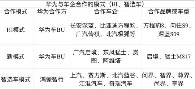 之一财经记者梳理发现,目前华为与车企的合作,主要包括三种模式:零部件供应模式、HUAWEI INSIDE(HI)模式和智选车模式(鸿蒙智行)。