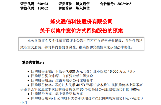 谈及本次回购股份的目的,烽火通信表示,此举是基于对公司未来持续稳定发展的信心和对公司股票价值的合理判断,为维护广大投资者利益,促进投资者对公司未来持续发展的信心和对公司价值的认可。
