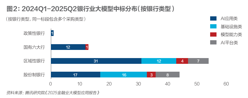 腾讯金融研究院发布的《2025金融业大模型应用报告》显示,2025年上半年,基于全网公开披露信息统计的大模型相关中标项目共79个,覆盖银行、证券、保险、信托与资管。其中,银行业中标项目44个,占比过半。
