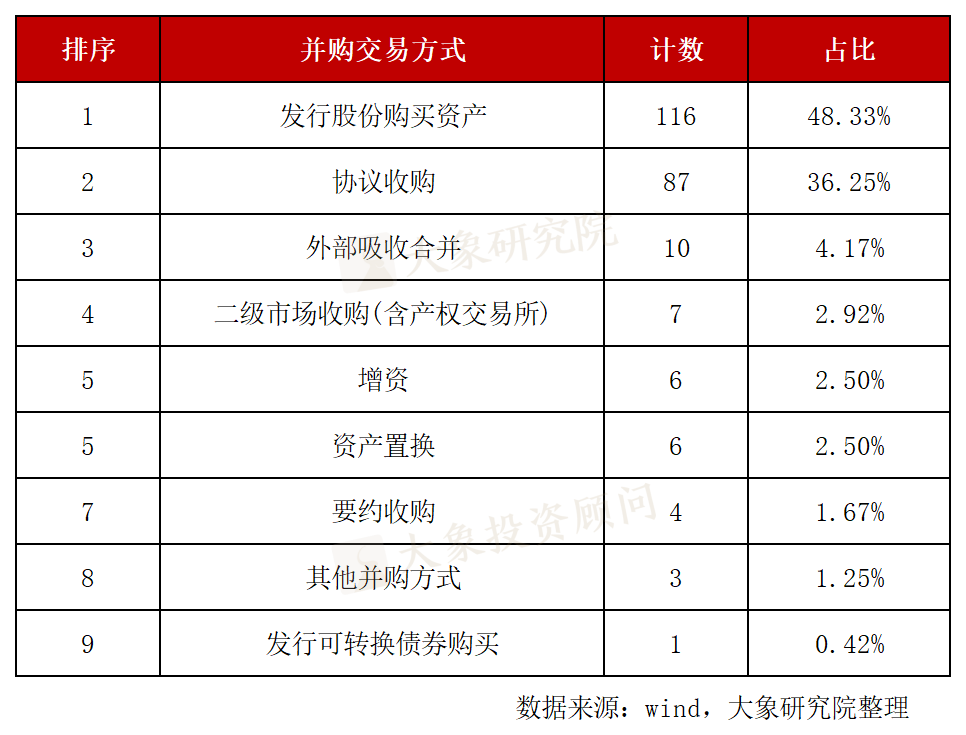 从240家上市公司的并购交易方式来看,发行股份购买资产有116家;协议收购有87家;外部吸收合并有10家;二级市场收购(含产权交易所)有7家;增资、资产置换各有6家;要约收购有4家;其他并购方式有3家;发行可转债券购买的有1家。