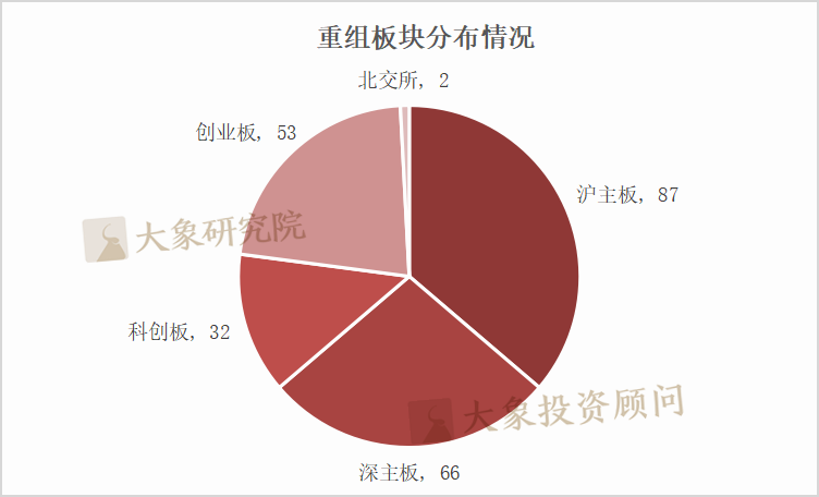 2025年A股上市公司最新披露的重组动态数量有240起事件中,沪主板最多,有87起,占比36%;深主板有66起,占比28%;创业板有53起,占比22%;科创板有32起,占比13%;北交所有2起,占比1%。