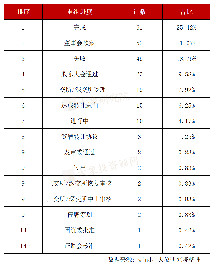 从240家上市公司的重组进度来看,完成有61家,董事会预案有52家,失败有45家,股东大会通过有23家,上交所/深交所受理有19家。