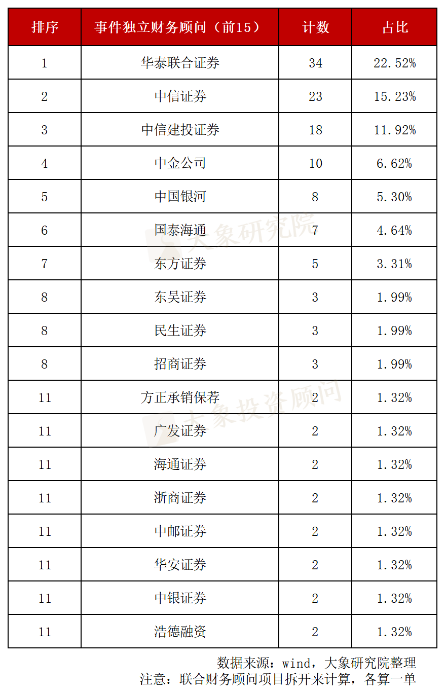 项目量最多的是,华泰联合证券,有34起并购项目,占比22.5%;其次是,有23单,占比15.23%;有18单,占比11.92%。