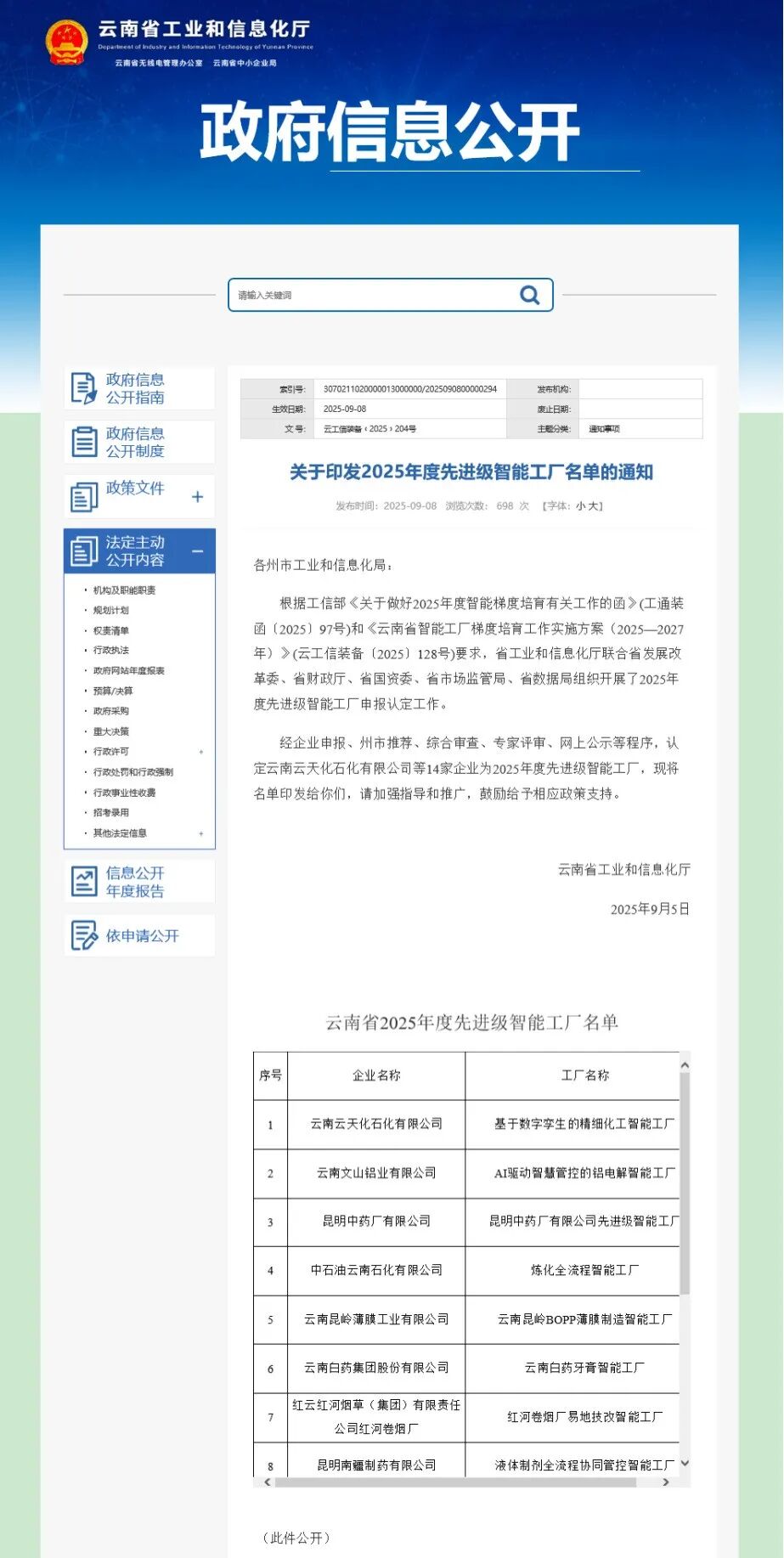 近日,云南省工业和信息化厅联合省级相关部门公布 2025 年度先进级智能工厂认定结果,集团股份有限公司牙膏智能工厂成功入选,成为全省 14 家获此殊荣的企业之一。