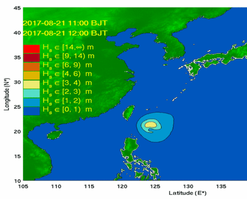 国家海洋预报台预计,9月24日上午到25日上午,南海西北部将出现7到12米的狂浪到狂涛区,南海东北部将出现4到6米的巨浪到狂浪区,北部湾将出现3到4.5米的大浪到巨浪区,近海海域海浪预警级别为橙色;广东近岸海域将出现4到7米的巨浪到狂浪,该近岸海域海浪预警级别为红色,福建南部、海南东部、广西近岸海域将出现2.5到3.5米的大浪,该近岸海域海浪预警级别为黄色,福建北部、浙江南部近岸海域将出现2到2.8米的中浪到大浪,该近岸海域海浪预警级别为蓝色。请在上述海域作业的船只注意安全,沿海各有关单位提前采取防浪避浪措施。