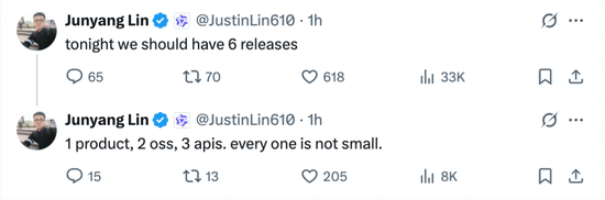 23日晚间,证券时报记者注意到,阿里通义千问团队负责人在个人社交平台上透露,阿里通义千问团队即将发布6个“新东西”,包含1个产品、2个开源模型、3个API接口,而且“每一个都不小”。