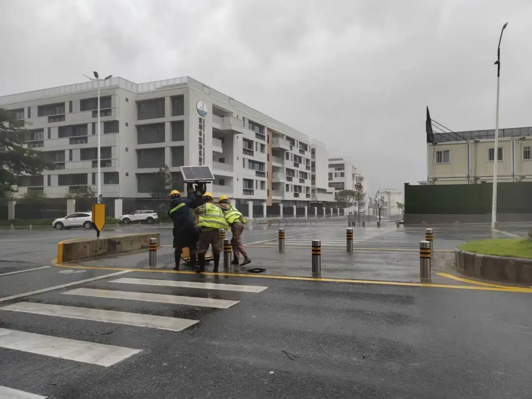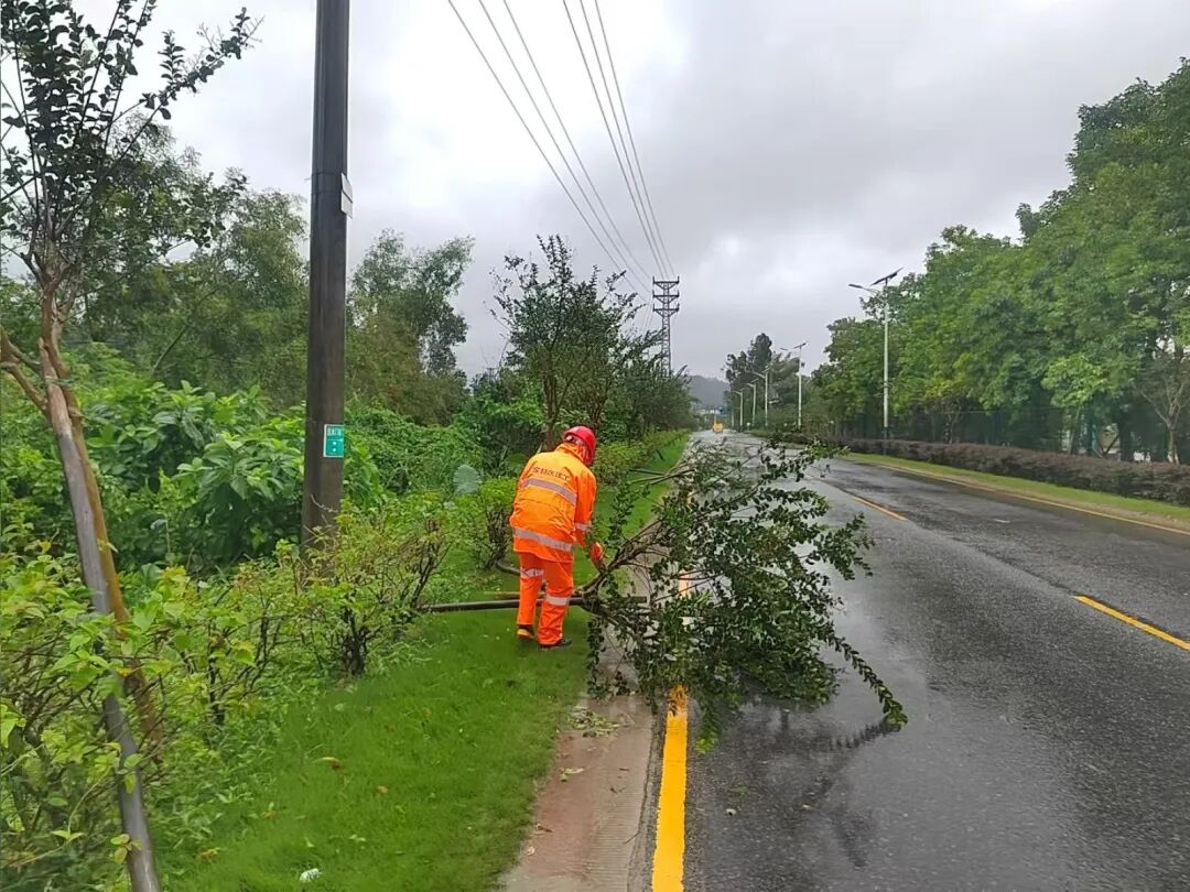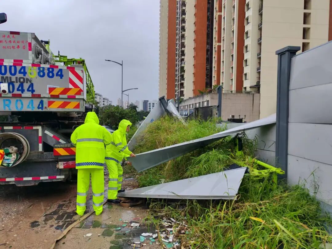 深汕交通局组织人员对倒伏树木、破损围挡进行清理,对信号灯进行加固,保障交通通畅。