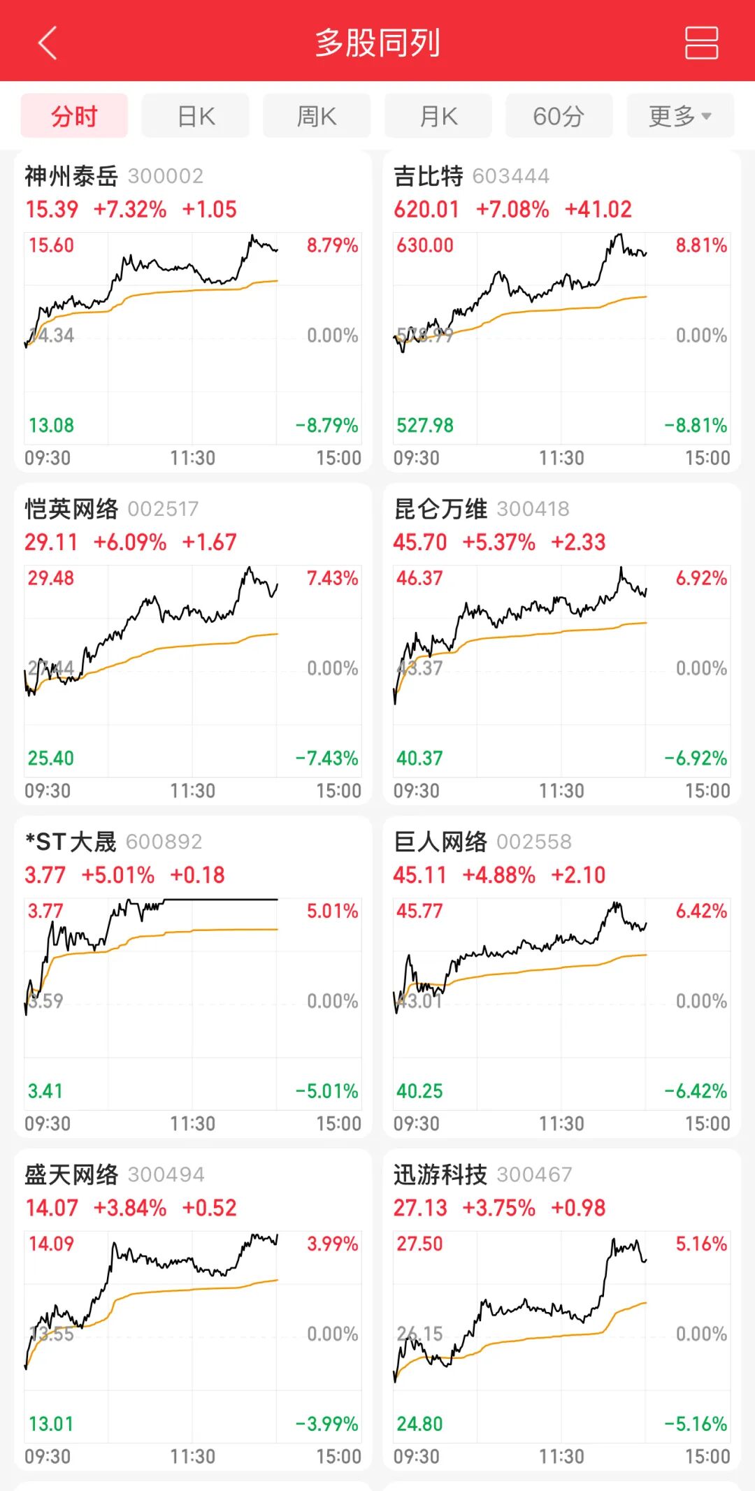 游戏板块拉升,截至发稿,、涨超7%,涨超6%,、等跟涨。