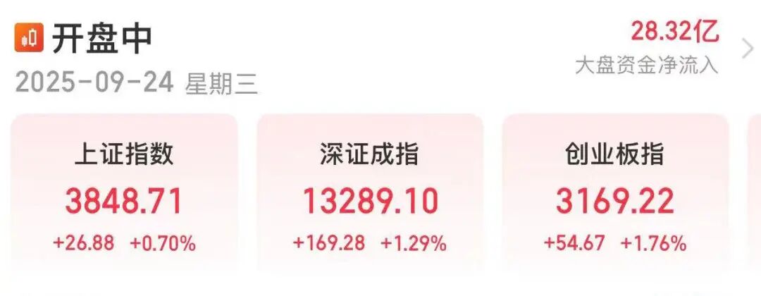 9月24日午后,创业板指持续走强,截至发稿涨超1.7%,报3169.22点;沪指涨超0.7%,报3848.71点;深证成指涨1.29%,报13289.10点。盘面上看,券商、固态电池、游戏板块涨幅居前。